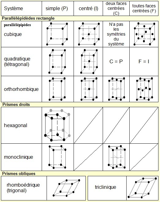 Nous avons décrit 7 réseaux élémentaires ou 7 formes de mailles ou 7 systèmes cristallins.