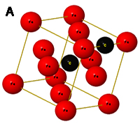 pour être dans le domaine de la structure austénitique (point A). La pièce est maintenue un certain temps à cette température pour atteindre un équilibre. Des atomes de carbone diffusent dans les mailles cristallines du fer de structure cubique à faces centrées. Un atome de carbone peut se glisser au centre de la maille et/ou au centre de chaque arête du cube (figure A).